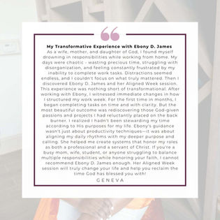 When you book your My Aligned Week session, you’re getting more than just a calendar tweak. You’re getting a comprehensive, personalized strategy designed to optimize your time, align with your goals, and create balance in your day-to-day life.